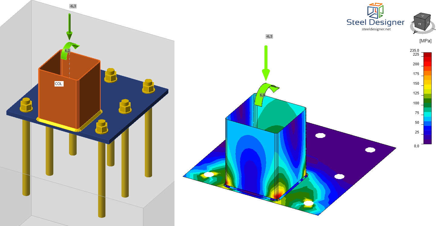 Design of all types of steel-steel connections and steel-concrete connections. We can design all types of bolted or welded connections, base plates and anchoring, using FEA software and internal procedures.